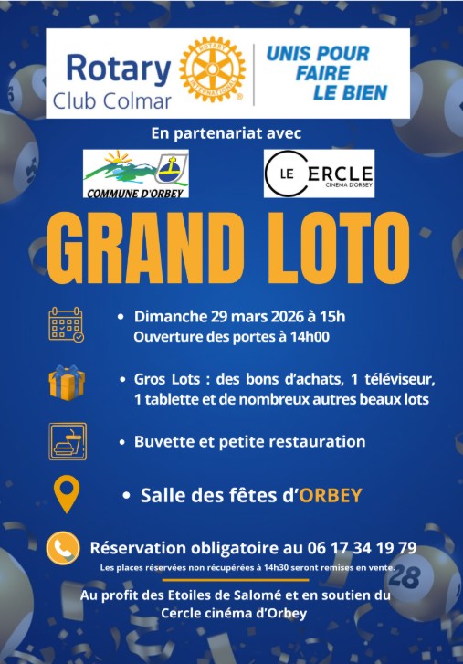 Grand loto le dimanche 29 mars organisé par le Rotary Club de Colmar à la salle polyvalente d’Orbey. Réservation au 06 82 67 60 69. au profit des Etoiles de Salomé et du cinéma d’Orbey